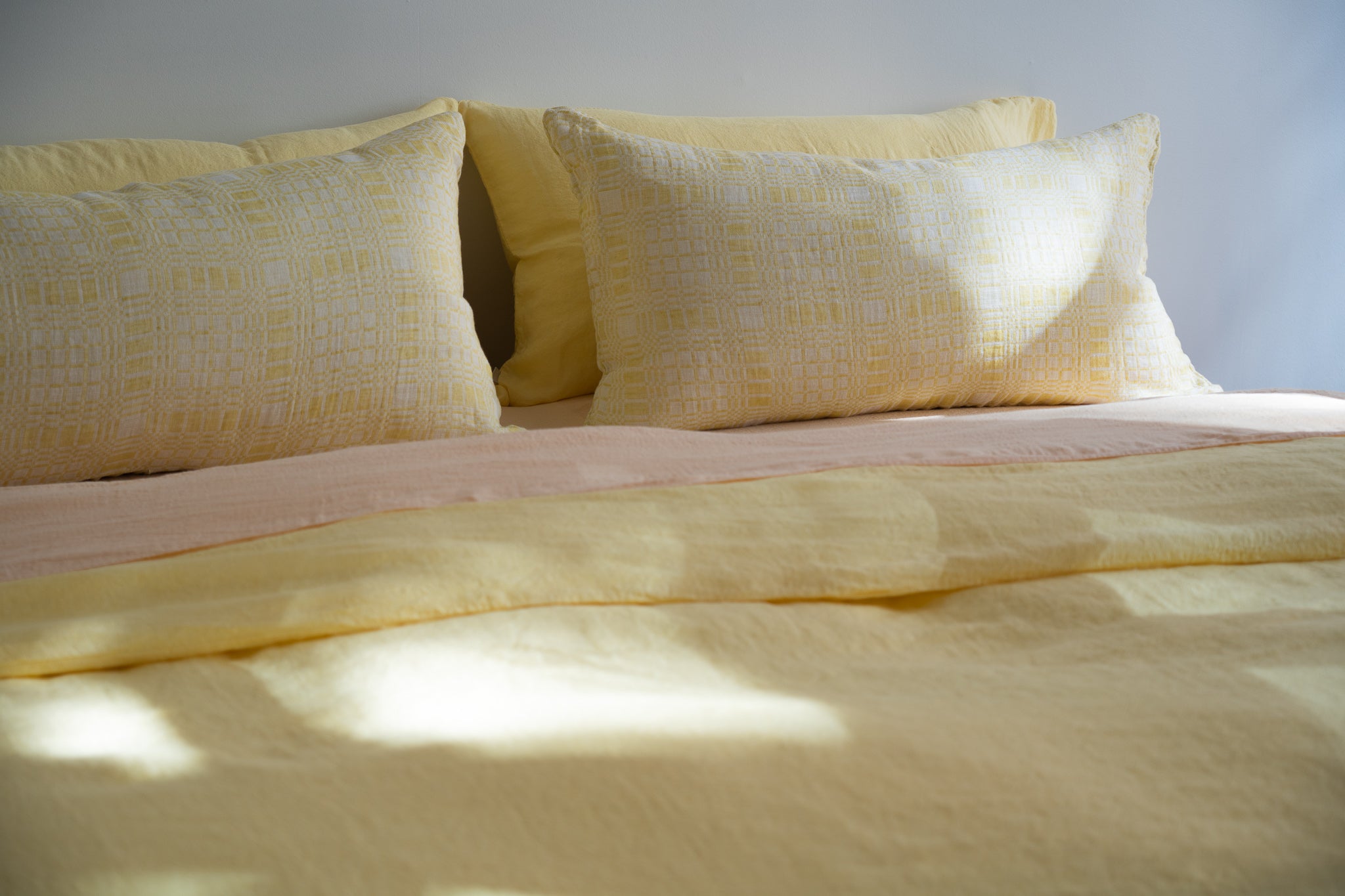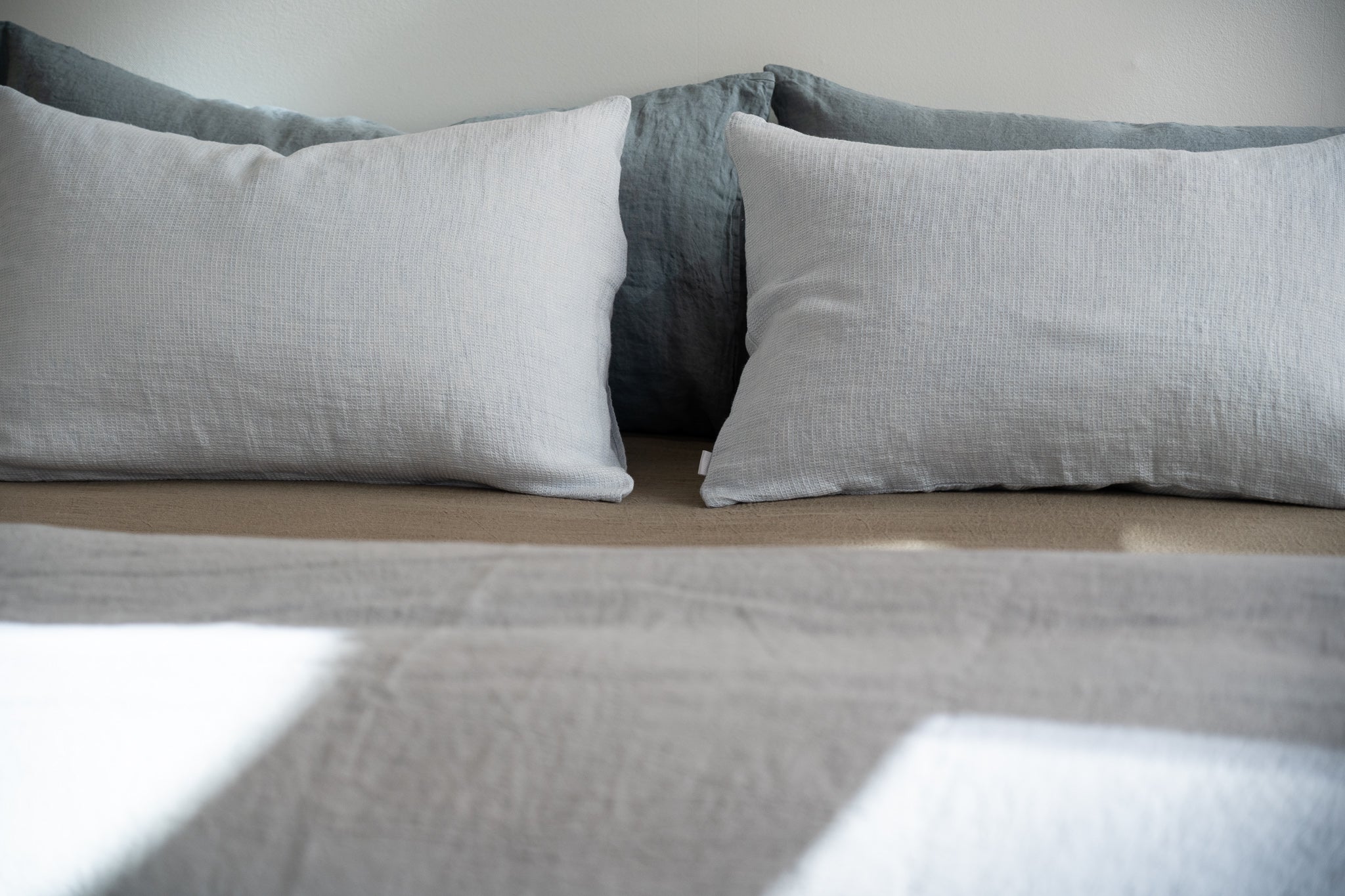 Create a serene, tonal look with our Waffle Pillow Sham Covers paired with Ocean Teal pillowcases, an Earth fitted sheet, and a Cloud Grey duvet cover.