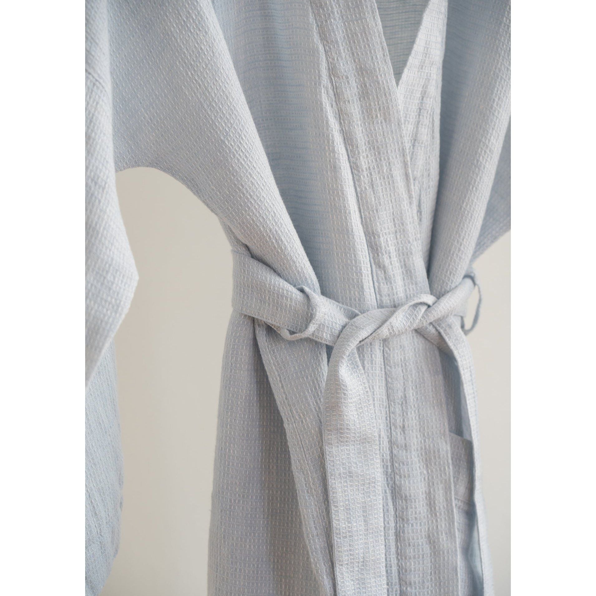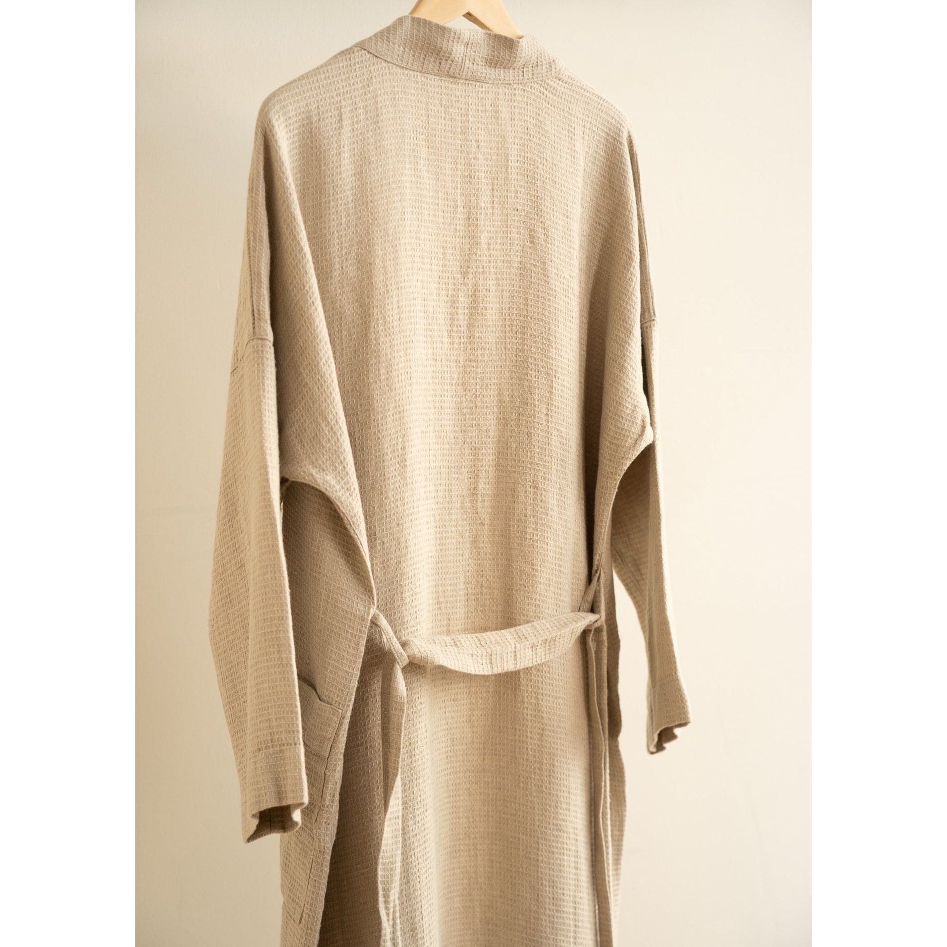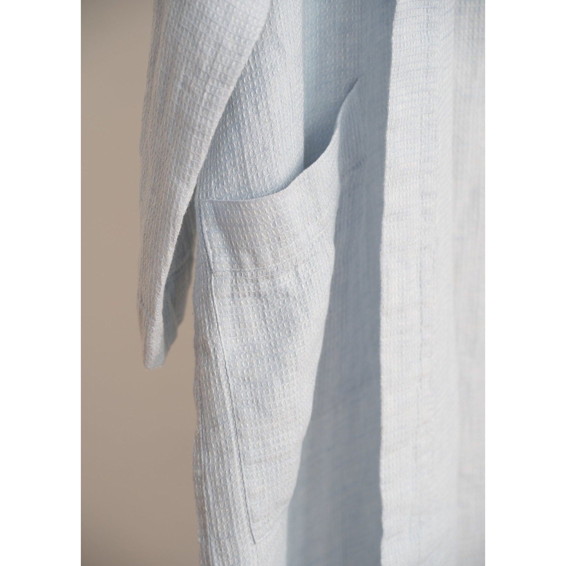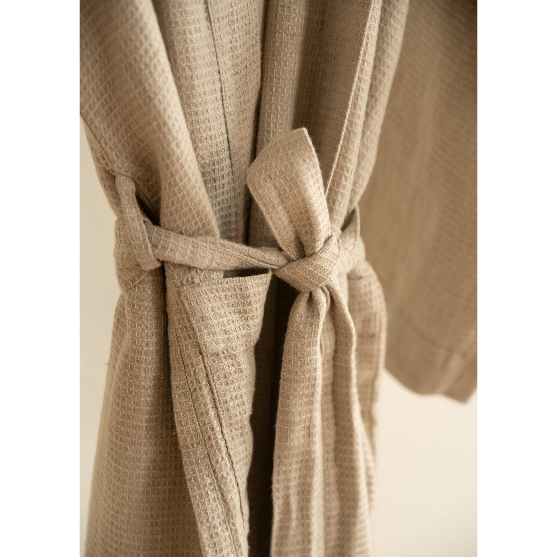 Lovingly crafted with a sumptuous waffle fabric, this linen bathrobe provides a comfortable and breathable choice for after-shower or relaxation moments. Its exquisite solid hues elevate your at-home wardrobe, while the lightweight material allows for year-round loungewear. The open front design and flexible integrated loop ensure effortless movement and ease of wear.