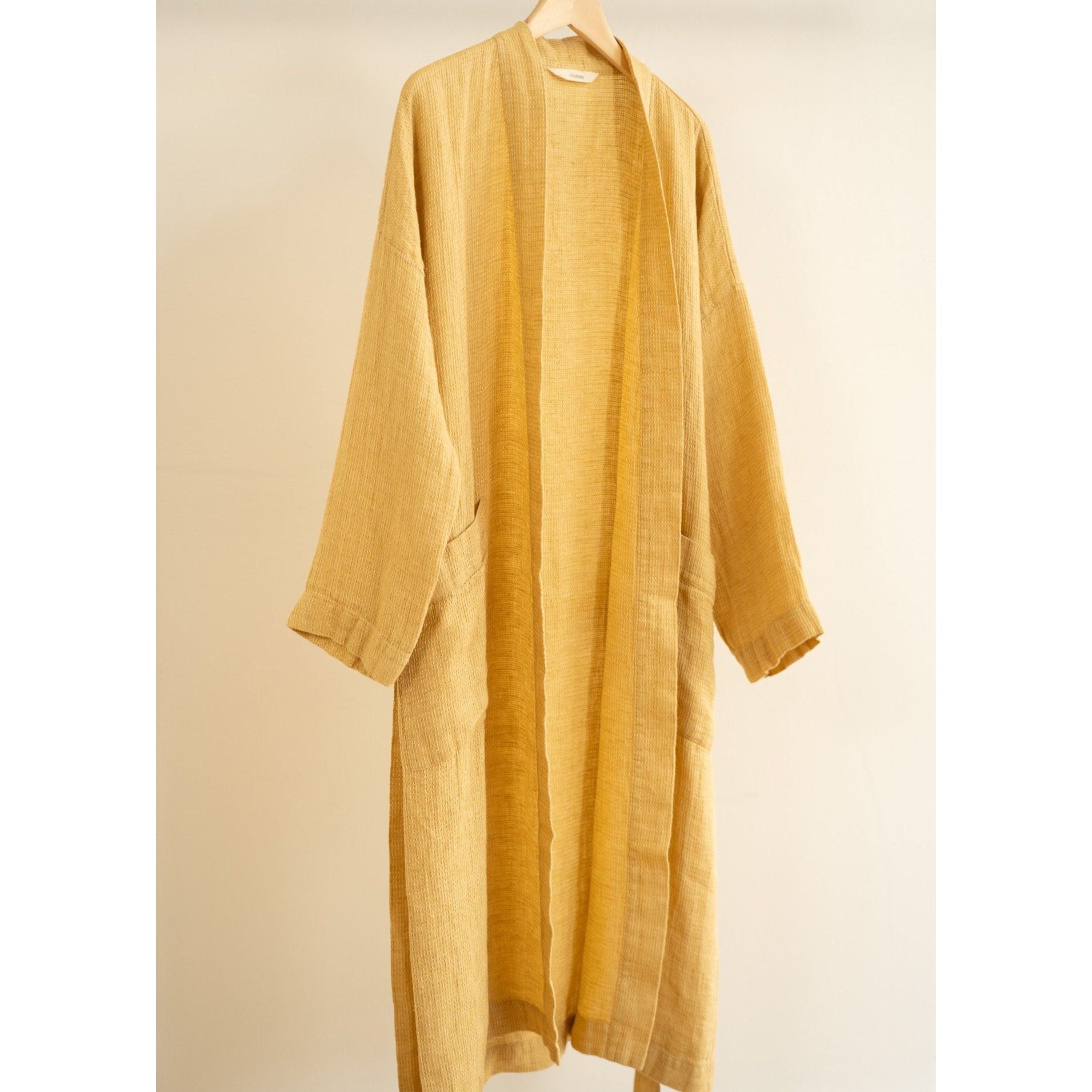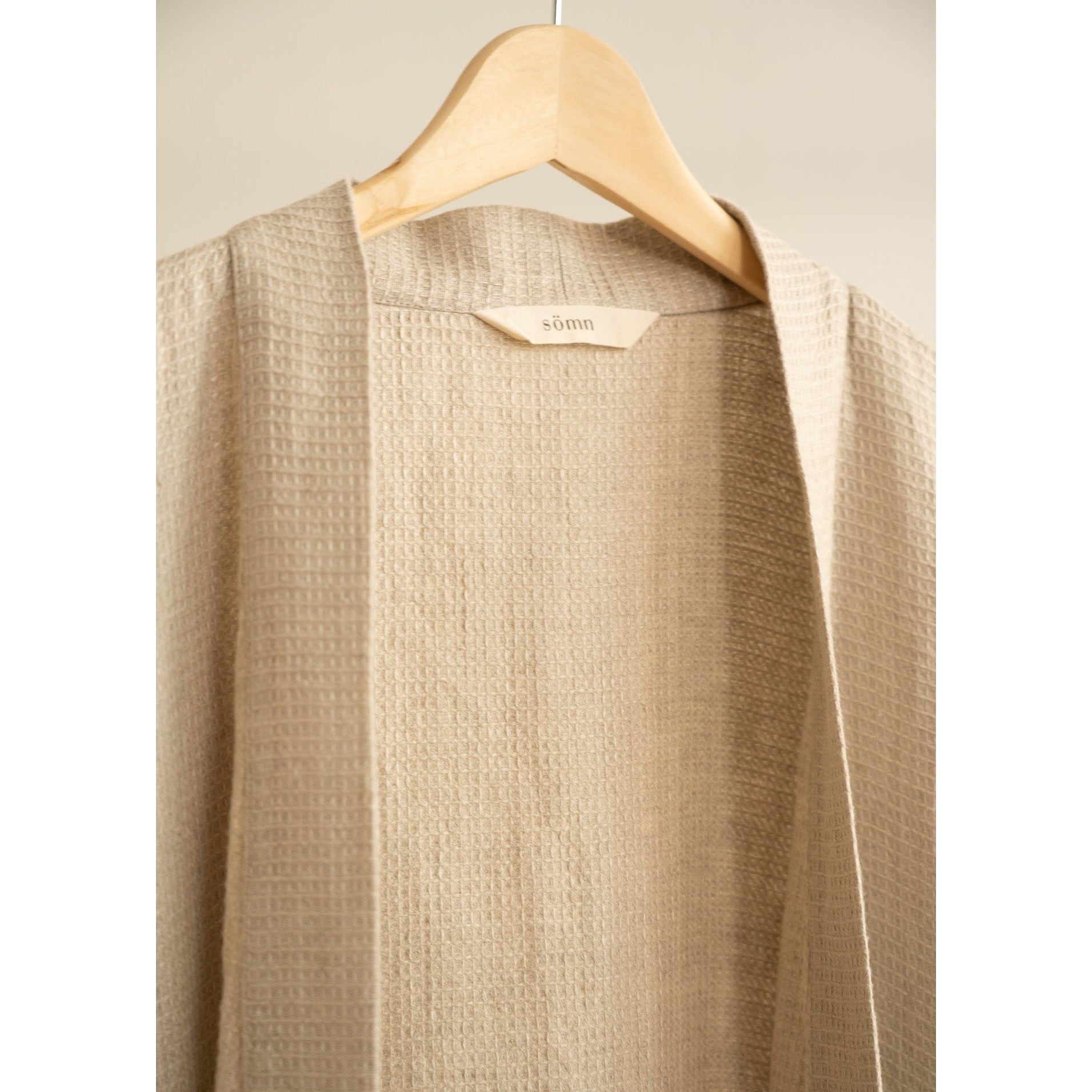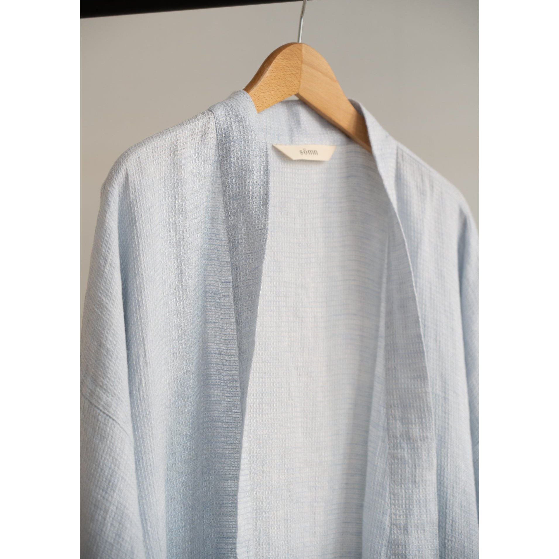 Lovingly crafted with a sumptuous waffle fabric, this linen bathrobe provides a comfortable and breathable choice for after-shower or relaxation moments. Its exquisite solid hues elevate your at-home wardrobe, while the lightweight material allows for year-round loungewear. The open front design and flexible integrated loop ensure effortless movement and ease of wear.